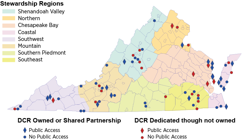 Commonwealth of Virginia的自然保护区、州立森林、州立公园和野生动物管理区提供了数百英里的步道,供人们享受(或进入)户外活动。 这些步道为公众提供了体验和享受该州的植物群、动物群、文化资源和美景的机会。徒步旅行、钓鱼、划船、狩猎、观赏野生动物、骑自行车和骑马都被证明有助于身体健康和心理健康——这是健康生活方式的一部分,可以减少所有人的疾病、肥胖和焦虑。