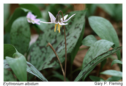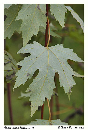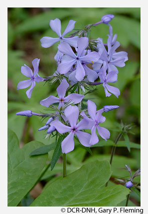 From the James River north, sandy river banks and first-bottom terraces that are frequently (but shortly) flooded support forests dominated by silver maple (Acer saccharinum) and boxelder (Acer negundo var. negundo), with herb layers containing many broad-leaved forbs such as wood-nettle (Laportea canadensis), clear-weed (Pilea pumila), and white snakeroot (Ageratina altissima var. altissima). Higher, better drained, sandy or silty river floodplains support mixed forests of sycamore (Platanus occidentalis), black walnut (Juglans nigra), hackberry (Celtis occidentalis), American elm (Ulmus americana), and boxelder, with understories of paw-paw (Asimina triloba) and spicebush (Lindera benzoin var. benzoin). Herb layers in the mixed floodplains are usually very lush with nutrient-demanding, early-season species such as Virginia bluebells (Mertensia virginica), Canada waterleaf (Hydrophyllum canadense), wild ginger (Asarum canadense), yellow trout-lily (Erythronium americanum ssp. americanum), white trout-lily (Erythronium albidum), Potomac River only), wild blue phlox (Phlox divaricata), miami-mist (Phacelia purshii), large solomon's-seal (Polygonatum biflorum var. commutatum), striped violet (Viola striata), and many others. Eastern cottonwood (Populus deltoides ssp. deltoides) is a frequent, early-successional pioneer of these habitats, while sycamore and river birch (Betula nigra) are pioneering invaders of stabilized depositional river bars.