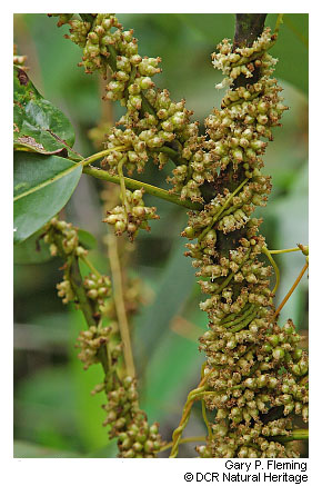 酸性更强、营养更贫乏的渗流沼泽主要分布在沿海平原,其特点是沙质或泥炭质基质中 覆盖着 泥炭藓的沼丘。这些栖息地通常比较潮湿,在一定程度上免受火灾的影响,尽管邻近的高地森林通常是火烧林;毫无疑问,在野火被广泛排除之前,火灾偶尔会在干燥时期烧到这些栖息地。主要的上层树种是红枫 (Acer rubrum )和黑桉 (Nyssa sylvatica ),郁金香树 (Liriodendron tulipifera )和龙柏 (Pinus taeda )在当地也很重要。常见的小乔木和灌木有甜海湾 木兰(Magnolia virginiana var. virginiana )、甜椒丛 (Clethra alnifolia )、高丛蓝莓 (Vaccinium spp.)、沼泽 杜鹃 ( Rhododendron viscosum var. viscosum ) 、光滑冬梅 (Ilex laevigata )和南方野葡萄干 (Viburnum nudum )。 菟丝子(Cuscuta compacta )通常大量附着在这些沼泽的灌木茎上。常见的草本植物包括肉桂蕨( Osmundastrum cinnamomeum )、网链蕨 (Lorinseria areolata )以及莎草 Carex lonchocarpa 和 Carex seorsa 。较少分布的草本物种或多或少可以被认为具有诊断意义(尤其是在沿海平原),包括臭鼬菜 ( Symplocarpus foetidus )、肾叶鹅掌楸 (Parnassia asarifolia )、柯林斯莎草 (Carex collinsii ) 、缠绕巴托尼亚 ( Bartonia paniculata ssp. paniculata ) 和联邦政府列出的沼泽粉红 (Helonias bullata )。