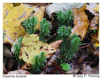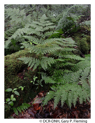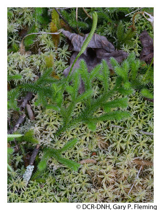 Red spruce forests and spruce-hardwood mixtures also occur locally at high elevations of Allegheny Mountain (above 1,100 m [3,600 ft]) and Jack Mountain (above 1,280 m [4,200 ft]) in Highland County, but differ considerably from the Southern Blue Ridge and Clinch Mountain stands. At least two compositional variants, associated with submesic ridge crests and mesic stream-head valleys, are present on Allegheny Mountain. Distinctly southern species are nearly lacking from these forests, while northern species such as late lowbush blueberry (Vaccinium angustifolium), stiff ground-pine (Spinulum annotinum), prickly tree-clubmoss (Dendrolycopodium dendroideum), and staghorn clubmoss (Lycopodium clavatum), are abundant.