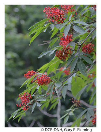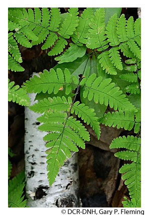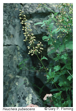 These open forests and woodlands occupy relatively unweathered boulderfields at elevations above 900 m (3,000 ft) in both the Blue Ridge and Ridge and Valley provinces. Communities in this group are known to occur from West Virginia south to northern Georgia. In Virginia, yellow birch (Betula alleghaniensis), American mountain-ash (Sorbus americana), and mountain maple (Acer spicatum) are the typical dominants of boulderfields weathered from granite, metabasalt, rhyolite, quartzite, and sandstone at the highest elevations. These habitats are usually best developed on north-facing slopes, where extreme winter temperatures, high winds, and ice storms strongly influence forest physiognomy. Trees here are typically gnarled and widely spaced because of difficult establishment and repeated damage from wind and ice. Typical shrubs include gooseberries (Ribes cynosbati, Ribes glandulosum, Ribes rotundifolium), hobblebush (Viburnum lantanoides), red raspberry (Rubus idaeus ssp. strigosus), and red-berried elder (Sambucus racemosus var. pubens ). The high cover of exposed rock in these habitats tends to limit overall species richness and herbaceous density. However, the Appalachian rock polypody (Polypodium appalachianum) is often abundant. Additional herbaceous species such as yellow blue-bead lily (Clintonia borealis), whorled aster (Oclemena acuminata = Aster acuminatus), Appalachian oak fern (Gymnocarpium appalachianum), marbled alumroot (Heuchera pubescens), brownish sedge (Carex brunnescens), and summer sedge (Carex aestivalis) may occur where substrate conditions are suitable. Cool microclimates favor the occurrence of many northern and high mountain species.