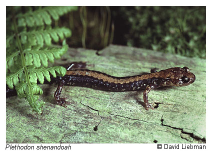 雪兰多蝾螈(学名 Plethodon shenandoah )是全球稀有且被联邦政府列入名录的物种,是蓝岭山脉北部(佩吉县和麦迪逊县)三个树木稀疏、海拔较高的巨石区的特有物种。
