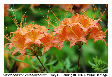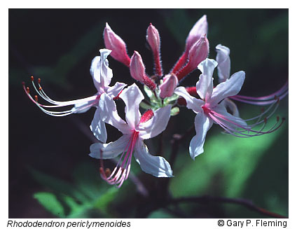 Forests overwhelmingly dominated by chestnut oak (Quercus montana, = Quercus prinus) are widespread on sandstone or quartzite ridges in the mountains, but occur locally on monadnocks, foothills, and rocky or gravelly bluffs throughout the Piedmont and inner Coastal Plain. On gentler, low-elevation terrain of eastern Virginia and the mountain valleys, white oak is more prominent in mixtures with several other oaks. Blackgum (Nyssa sylvatica) and sourwood (Oxydendrum arboreum) are frequent overstory associates and abundant understory trees, along with sassafras (Sassafras albidum) and downy serviceberry (Amelanchier arborea). Decades of fire suppression or exclusion has led to a general abundance of the fire-intolerant red maple (Acer rubrum) in oak / heath forest understories. Ericaceous (heath-family) plants, including mountain laurel (Kalmia latifolia), black huckleberry (Gaylussacia baccata), wild azalea (Rhododendron periclymenoides), and blueberries (Vaccinium spp.), form dense colonies in the shrub and herb layers. Evergreen rhododendrons (Rhododendron maximum and Rhododendron catawbiense) and flame azalea (Rhododendron calendulaceum) are locally prevalent members of the ericaceous shrub complex in the mountains, while dangleberry (Gaylussacia frondosa) is a prominent ericad in the Coastal Plain. The ericaceous sub-shrubs trailing arbutus (Epigaea repens) and wintergreen (Gaultheria procumbens) may also be abundant, especially in the mountains. The density of ericaceous species may be closely tied to land-use and disturbance history. True herbaceous species are sparse, but may include scattered individuals or colonies of xerophytes such as galax (Galax urceolata), yellow wild indigo (Baptisia tinctoria), pink lady's-slipper (Cypripedium acaule), dwarf iris (Iris verna), large whorled pogonia (Isotria verticillata), cancer-root (Orobanche uniflora), gaywings (Polygaloides paucifolia), eastern bracken fern (Pteridium aquilinum ssp. latiusculum), and Virginia goat's-rue (Tephrosia virginiana).