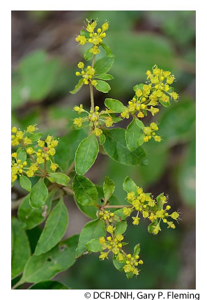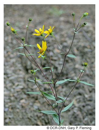 Although stunted trees of several species - e.g. , chestnut oak (Quercus montana), northern red oak (Quercus rubra), Virginia pine (Pinus virginiana) and pignut hickory (Carya glabra) - are common, shale barrens are strongly characterized by their relatively open physiognomy and by a suite of uncommon and rare plants found almost exclusively in these habitats. Endemic or near-endemic shale barren species include shale barren rock cress (Boechera serotina), white-haired leatherflower (Clematis albicoma), Millboro leatherflower (Clematis viticaulis); also endemic to Virginia), shale barren wild buckwheat (Eriogonum allenii), shale barren evening-primrose (Oenothera argillicola), shale barren ragwort (Packera antennariifolia), and Kate's Mountain clover (Trifolium virginicum). Other more or less widespread and characteristic herbaceous species of Virginia shale barrens include Pennsylvania sedge (Carex pensylvanica), little bluestem (Schizachyrium scoparium var. scoparium), poverty oatgrass (Danthonia spicata), wavy hairgrass (Avenella flexuosa), moss phlox (Phlox subulata), mountain nailwort (Paronychia montana), rock spikemoss (Bryodesma rupestre), shale barren pussytoes (Antennaria virginica), dwarf cinquefoil (Potentilla canadensis), smooth sunflower (Helianthus laevigatus), false boneset (Brickellia eupatorioides var. eupatorioides), hairy wood mint (Blephilia ciliata), and western wallflower (Erysimum capitatum var. capitatum), Bath and Alleghany Counties only).