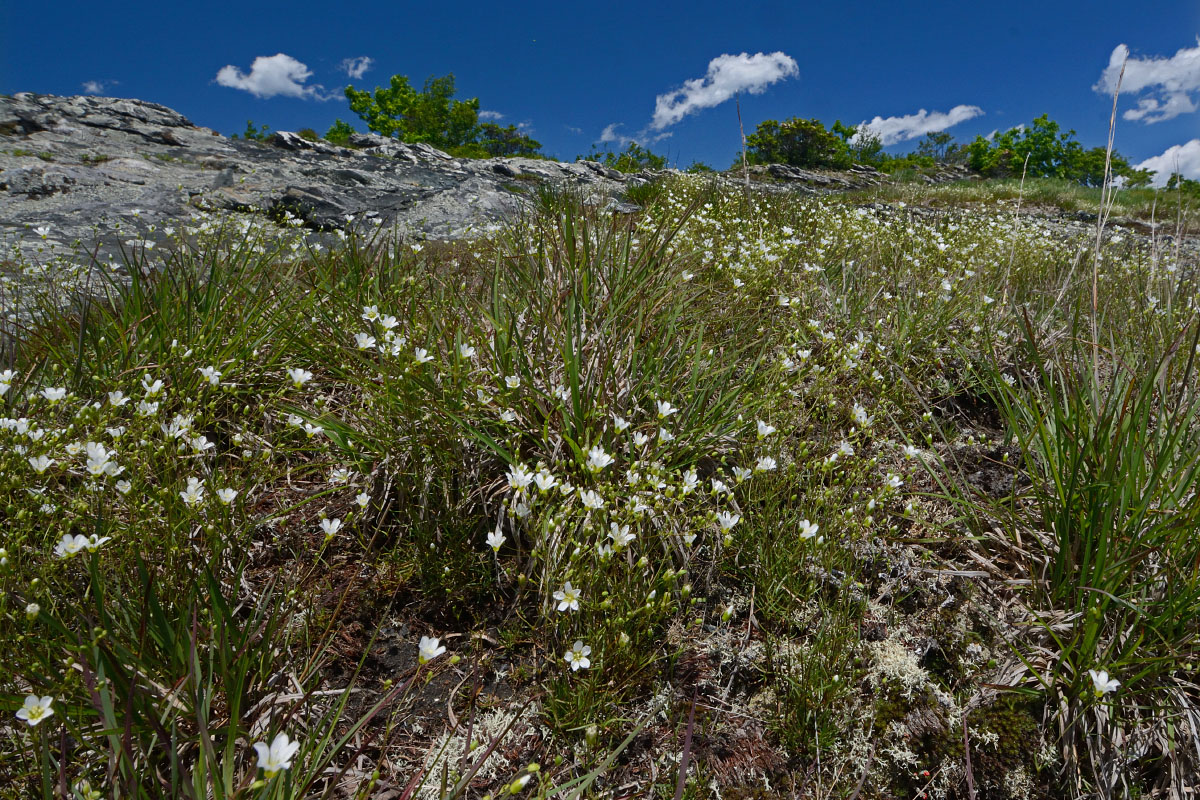 (Editors: Follow this link to download an image. Photo caption: Mountain sandwort (Minuartia groenlandica) at Buffalo Mountain Natural Area Preserve, Floyd County. Photo by Virginia Department of Conservation and Recreation.][alt:Photo showing white flowers on top of rocky summit of mountain.)