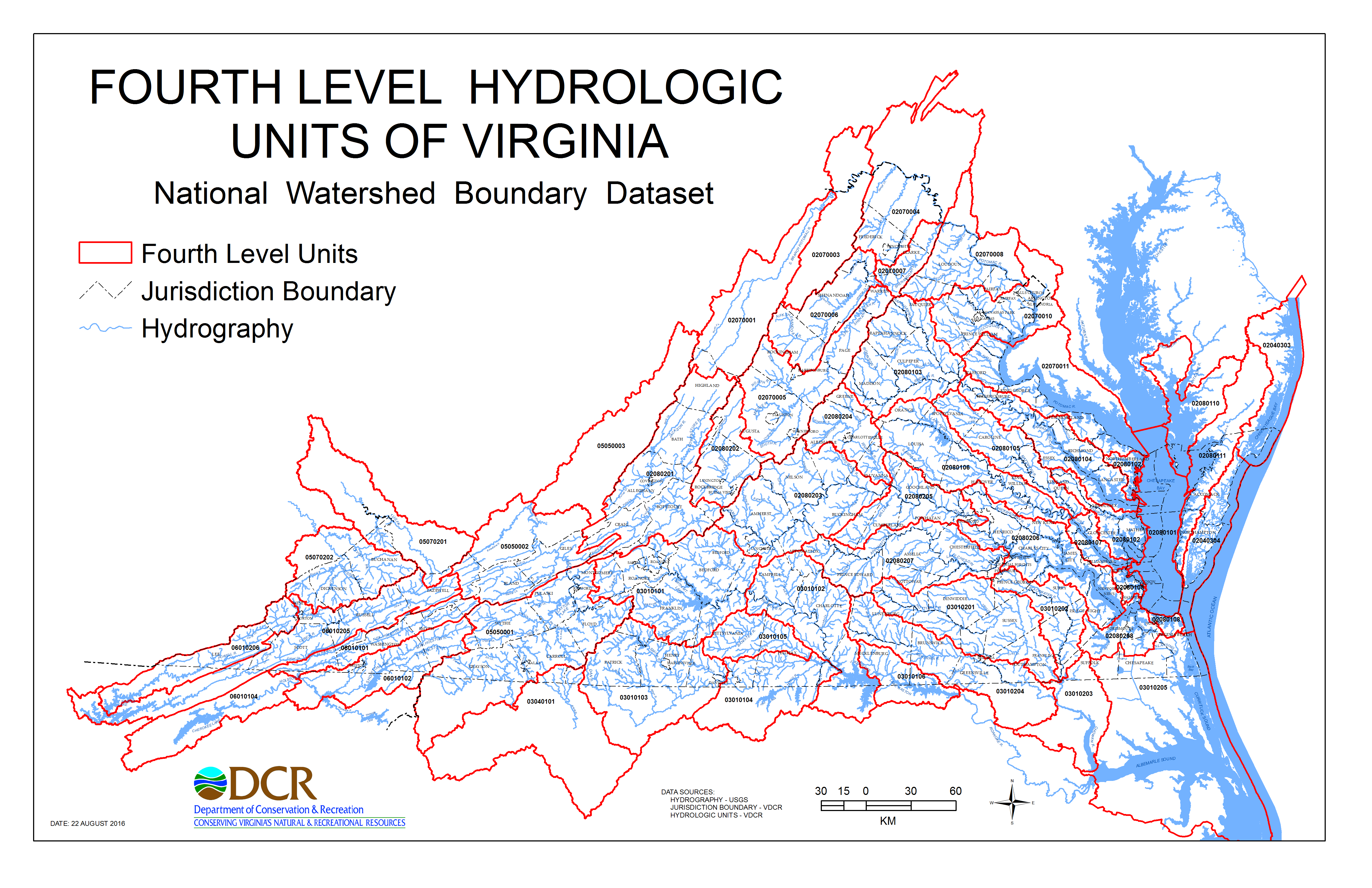 作为弗吉尼亚州 WBD 开发过程的一部分,DCR 划分了6个级别单位,以尽可能保留1995弗吉尼亚水文单位边界的意图,从而简化两个系统之间的过渡。