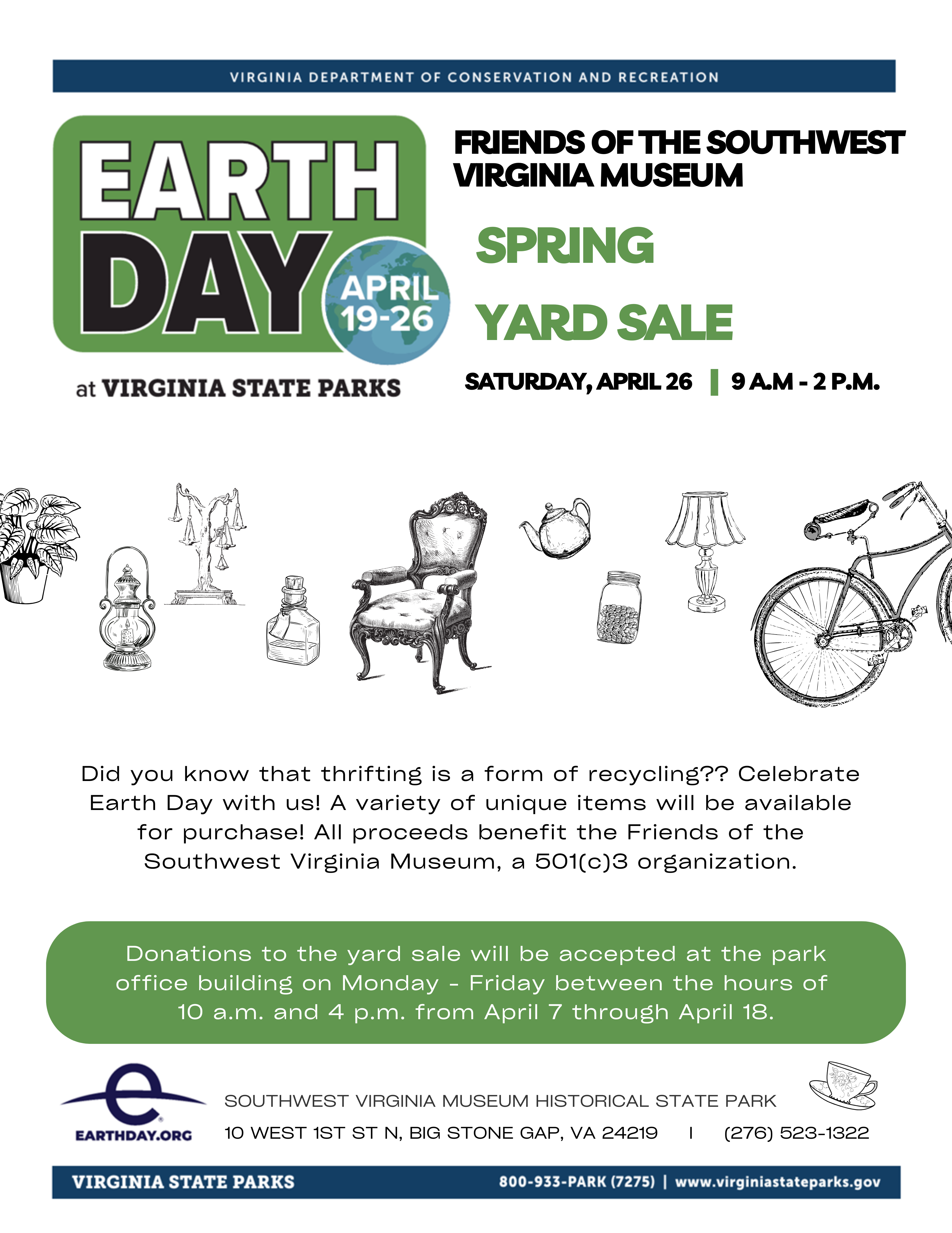 西南弗吉尼亚博物馆之友将于 4 月26星期六上午9举办地球日庭院拍卖筹款活动– 下午2庭院拍卖会将提供各种物品供购买,所有收益将捐献给西南弗吉尼亚博物馆历史州立公园之友。